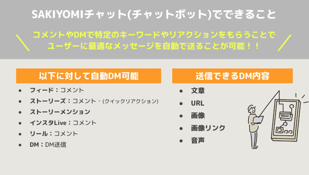 当ツールは、Meta社(Instagram)の公式APIを使用し、InstagramアカウントにコメントやDMをしたユーザーへ、自動でDMメッセージ送信や、アンケート送信・抽選を行なったりできるツールです。