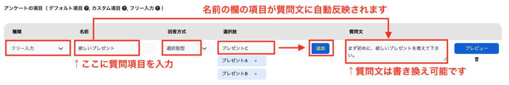 デフォルト項目以外は、「フリー入力」で都度質問を入力するか、事前にカスタム項目を作成してカスタム項目を表示させることが可能です。