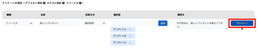 右側の[プレビュー]ボタンクリックで、送信されるアンケートの表示が確認できます。
