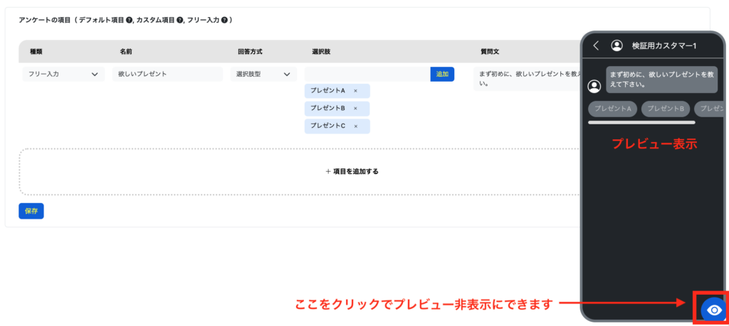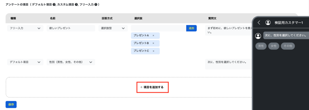 質問項目を入力(欲しいプレゼントなど)→[保存]をクリック