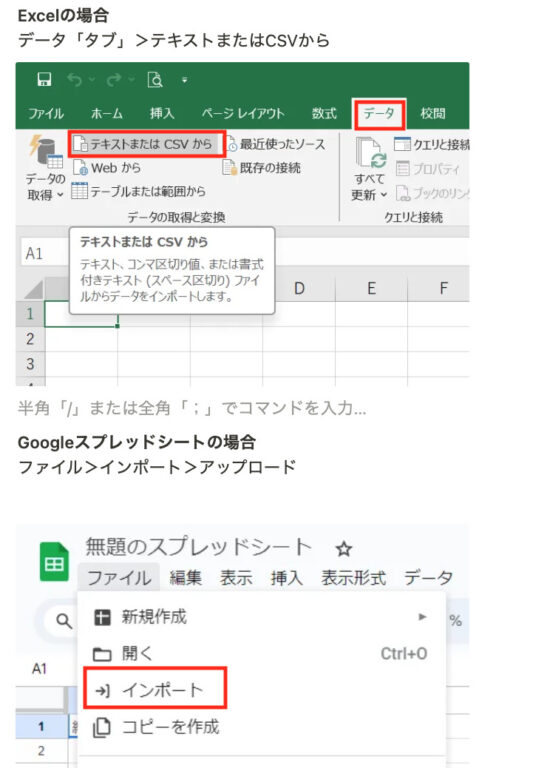 ダウンロードしたcsvファイルはそのまま開くと文字化けしますので、ExcelまたはGoogleスプレッドシートに取り込みしてください。(MacOSの場合はNumbersで開くと正常に表示されます。)