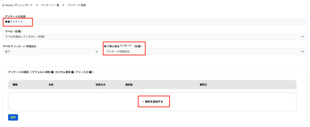 ④アンケート項目の設定が終了したら[保存]ボタンをクリック