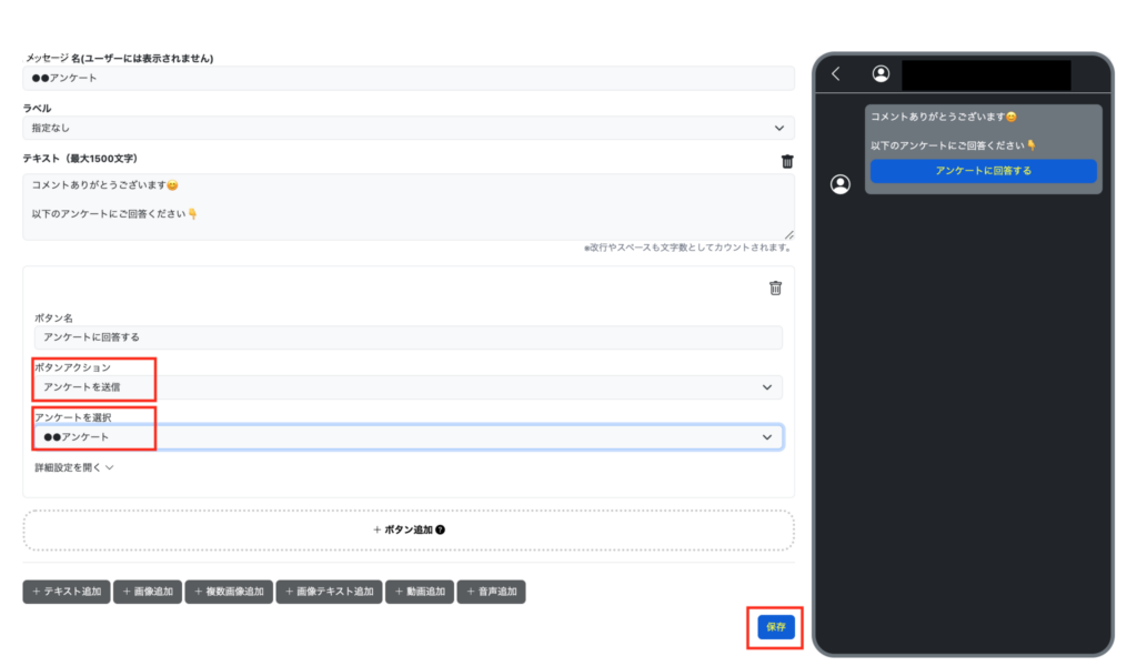 +テキスト追加 +ボタン追加 >ボタンアクションで[アンケートを送信]を選択