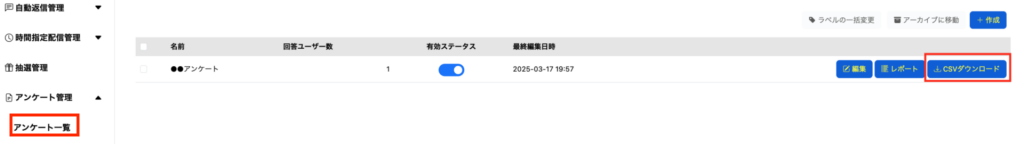 アンケート管理 >アンケート一覧 で、取得したいアンケート右側の[CSVダウンロード]ボタンをクリックすることでCSVファイルをダウンロードすることが可能です。
