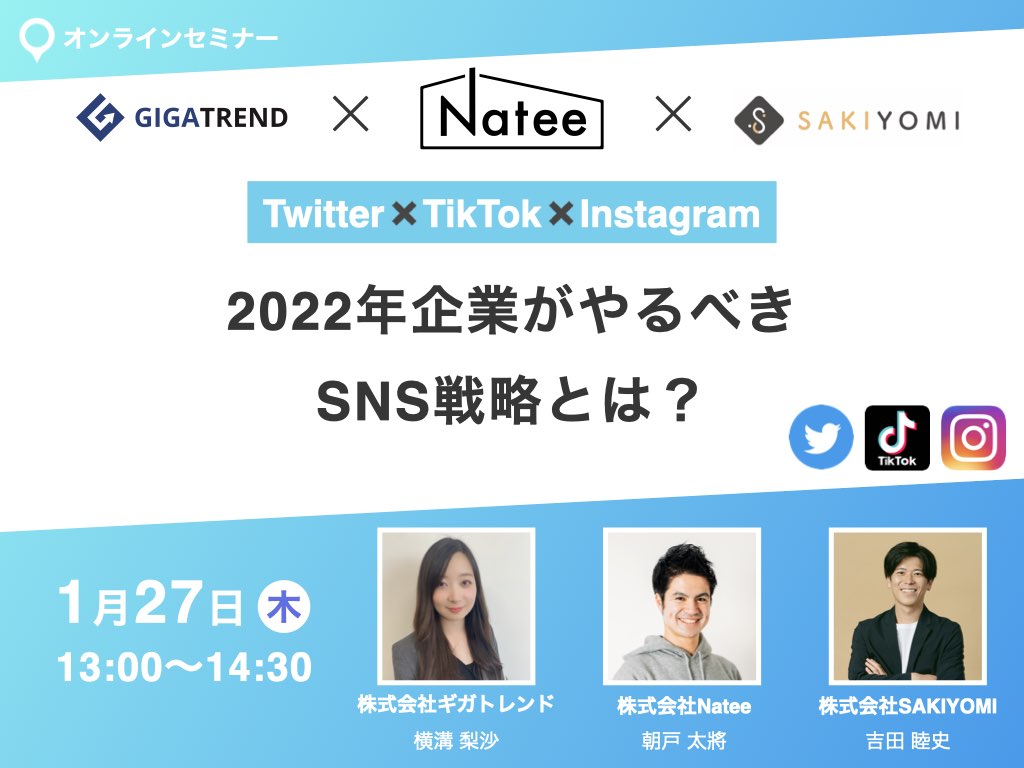 今回は株式会社Natee様と株式会社ギガトレンド様と3社セミナーを開催致します!「Twitter✖️TikTok✖️Instagram」を活用した最新のSNS運用方法を事例を用いて徹底解説します。