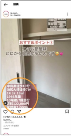 紹介されている物件が気に入れば、ユーザーは家賃や駅までの距離などの物件情報が気になることでしょう。こういったユーザーは最後まで見ざるを得なくなります。また、この物件情報はわずか数秒しか表示されません。そのため、見逃したユーザーはもう一度再生する必要が生まれるわけです。ここでまた「アカウントの滞在時間が伸び、アルゴリズム的に優遇される」という好循環が生まれます。